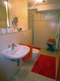 - Badezimmer mit Dusche/WC (mit Fußbodenheizung), Föhn und Kosmetikspiegel, Handtuchwärmer