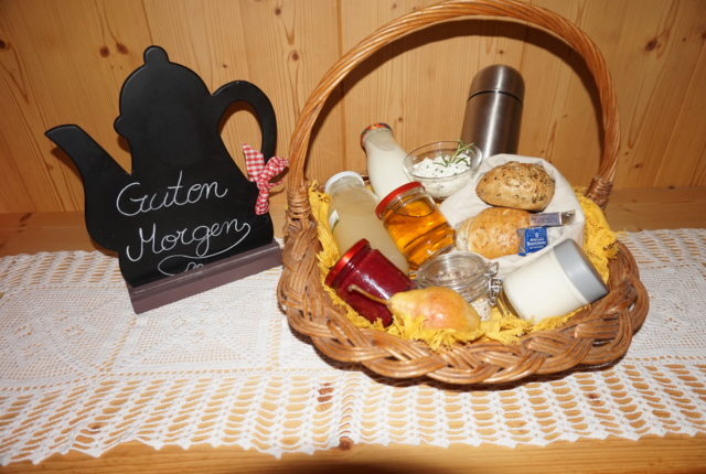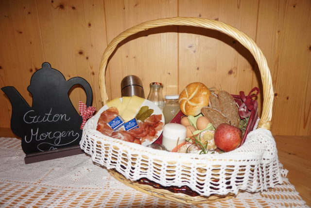 Beginnen Sie den Tag mit einem liebevoll zusammengestellten Frühstückskorb, gefüllt mit Produkten wie: Milch, Joghurt, Frischkäse, Fruchtaufstrich,Tee, Sirup/Saft, Frühstücksdessert/Kuchenschnitte und Honigund regionalen Produkten wie: Eier, Wurstwaren,Käse, Brot, Müsli, Butter und Obst (nach Saison).